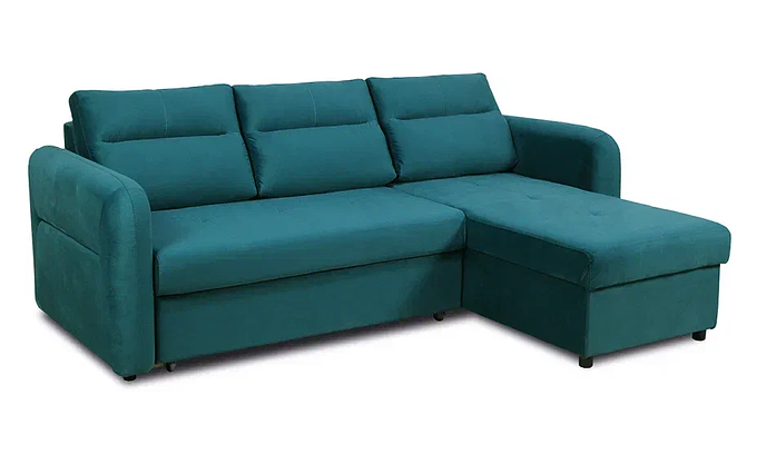 Диван угловой. Каркас сборный, усиленный, из массива древесины хвойных пород. В основе сидений - упругая пружина-змейка, ППУ . Ламинированный короб для хранения в оттоманке. Подлокотники съёмные. ШхГхВ, мм: 2220х1650х910 Спальное место, мм: 1920х1380 Высота сиденья, мм: 450 Механизм трансформации: Дельфин Диван только в ткани серии Фреш