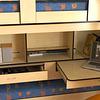 Пока днем кровать не нужна, она вдвинута в комплекс, а на её место можно выдвинуть столы, за которыми удобно делать уроки.