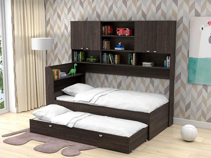 Для двоих детей от 3 лет. В комплекте: односпальная кровать, антресоль с полочками и шкафчиками, большой выкатной ящик для игрушек, белья или в качестве полноценной спального места. Нагрузка на каждое спальное место до 70 кг с учетом матраса. Матрасы не входят в стоимость, но вы можете подобрать их и приобрести дополнительно.