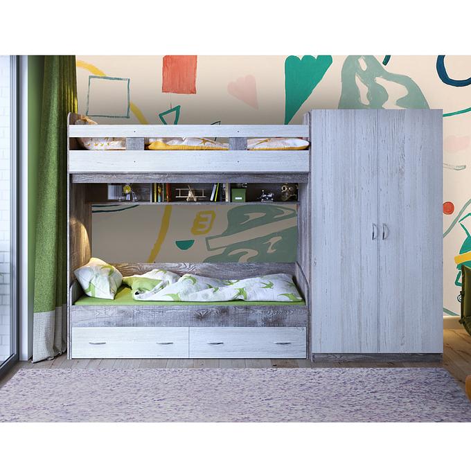 Кровать чердак Юта 2 оснащен двумя спальными местами, необычными ступенями с дверцами для хранения игрушек и шкафом для одежды и белья.