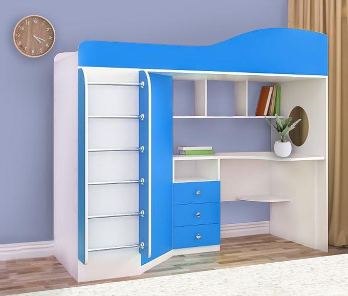 Кровать-чердак Кадет 1 оснащен одним спальным местом, металлической наставной лестницей, письменным столом с тремя выдвижными ящиками под столешницей, полкой над столешницей и угловым шкафом для одежды.