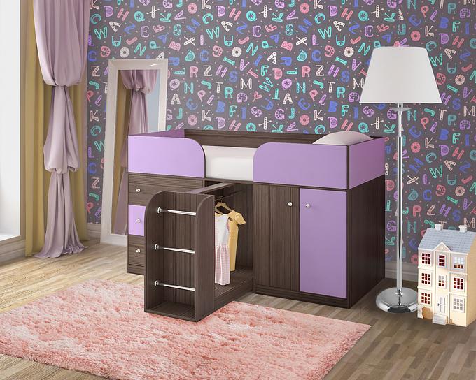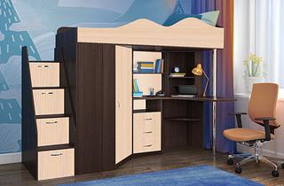 Кровать чердак Малыш 4 решает проблему малого пространства сочетая в себе целый ряд функций: кровать, большой шкафчик для вещей или игрушек, комод с 3-я глубокими ящиками, а так же выдвижную лестницу-гардероб. Мебель изготовлена из ламинированного ДСП, с использованием кромки АБС, что позволяет продлить срок службы изделию и сохранить внешний вид. На цветных фасадах светло-бежевая кромка.