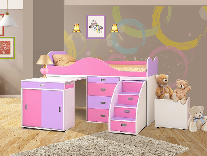 Кровать чердак Малыш Люкс - удобная кроватка, вместительный комод, выдвижной столик с ящиком и торцевым шкафом, а также удобная банкетка.
