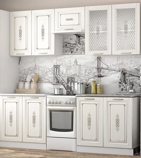 Цвет: сандал белый матовый с фотопечатью. Корпус гарнитура изготовлен из белого ЛДСП. Фасады МДФ в цвете сандал белый матовый с фотопечатью. Гарнитур состоит из: Верхний шкаф с двумя дверцами 800 (стекло с фотопечатью) Верхний шкаф 600, высота 360(располагается над плитой) Верхний шкаф с двумя дверцами 800 Глубина модулей 320, высота 720 Шкаф под мойку мойка накладная 800*600 приобретается отдельно) Шкаф нижний с двумя дверцами 800 Глубина нижних модулей 445 мм и высота 845 Столешница 800/600 в цвете Антарес . Возможность дополнить модулями: нет
