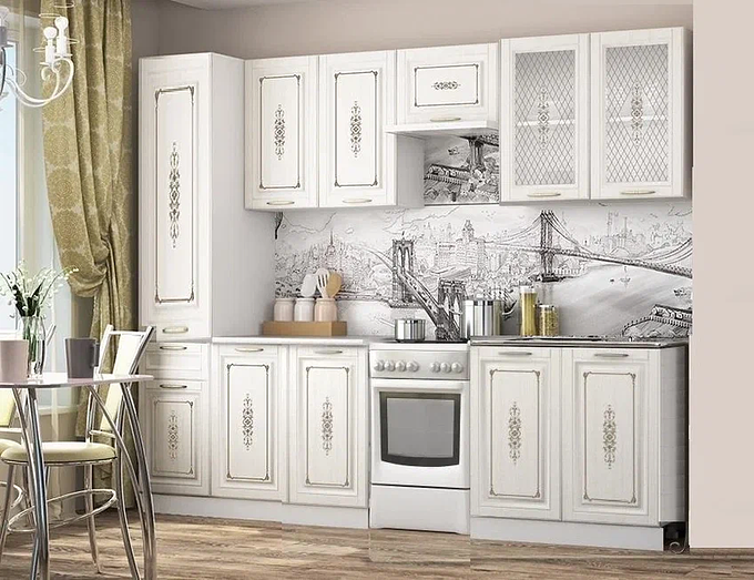 Кухонный гарнитур 2,6 метра "Велес" Цвет: сандал белый матовый с фотопечатью Корпус гарнитура изготовлен из белого ЛДСП. Фасады МДФ в цвете сандал белый матовый с фотопечатью. Пенал ГЛУХОЙ БЕЗ СТЕКЛА: в-2140, ш-400, г-580. Шкаф верхний с двумя дверцами 800 Шкаф верхний 600 (располагается над плитой, высота 360) Шкаф верхний с двумя дверцами 800 (стекло с фотопечатью) Высота модулей 720, глубина 320 Шкаф под мойку 800 (мойка накладная 800*600 приобретается отдельно) Шкаф нижний с двумя дверцами 800 Глубина нижних модулей 445 мм и высота 845 Столешница 800/600 в цвете Антарес Возможность дополнить модулями: нет