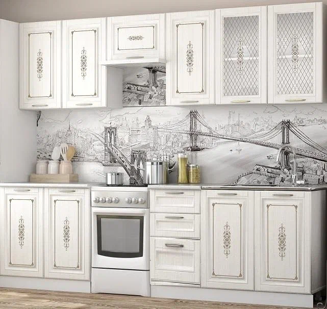 Цвет: сандал белый матовый с фотопечатью Корпус гарнитура изготовлен из белого ЛДСП. Фасады МДФ в цвете сандал белый матовый с фотопечатью. Гарнитур состоит из: Шкаф верхний с двумя дверцами 800 (стекло с фотопечатью) Шкаф верхний 600 (располагается над плитой, высота 360) Шкаф верхний с двумя дверцами 800 Шкаф верхний 400 Глубина модулей 320, высота 720 Шкаф под мойку 800 (мойка накладная 800*600 приобретается отдельно Шкаф нижний с двумя дверцами 800 Шкаф нижний 400 (3 выдвижных ящика на роликовых направляющих) Глубина нижних модулей 445 мм и высота 845 Две столешницы 800/600 и 400/600 в цвете Антарес Возможность дополнить модулями: нет