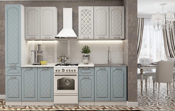 Цвет: сандал белый/голубая патина Материал корпуса - ЛДСП. Фасады изготовлены из МДФ с фрезеровкой. Корпус гарнитура белый. Верхние фасады в цвете сандал белый, а нижние фасады в цвете голубая патина. Верхние модули: Высота - 720 мм., Глубина - 320мм., Ширина модулей 800мм. Шкаф верхний с двумя дверцами 800 2шт Шкаф верхний 400мм со стеклом с пескоструем Нижние модули Высотой 845 мм, Глубина 445 мм, Ширина модулей 800мм Шкаф нижний с двумя дверцами 800 Шкаф нижний под мойку 800 (для установки накладной мойки с размером 800*600) Шкаф нижний 400 (один выдвижной ящик на роликовых направляющих) Столешница "Антарес" : глубина - 600мм. Ширина 800+400 Мойка накладная 800*600 в стоимость не входит Гарнитур шириной 2,4 метра комплектуется Пеналом. Ширина пенала 400 мм. Высота 2140 и глубиной 580 мм. Пенал глухой в цвете голубая патина с одним выдвижным ящиком на роликовых направляющих. Пенал или левый или правый - на Ваше усмотрение Возможность дополнить модулями: нет
