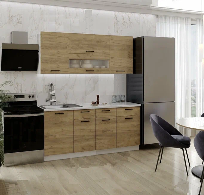 Цвет: крафт золотой Корпус: ЛДСП белый Фасад: ЛДСП в цвете крафт золотой Стекло: Сатинат Ручки: Пластмассовые Ножки: Пластмассовые , регулируемые по высоте Цоколь: В цвет корпуса Шкафы верхние: глубина 320 мм, высота 720 мм Шкаф верхний 500 2шт Шкаф верхний 800 Шкаф верхний 800 (со стеклом) Шкафы нижние: глубина 445 мм, высота 845 мм Шкаф под мойку 500 Шкаф нижний 800 (с двумя выдвижными ящиками на роликовых направляющих) Шкаф нижний 500 (так же с выдвижным ящиком на роликовых направляющих) Столешница Антарес длинной 1800 мм и толщиной 26 мм Возможность дополнить модулями: нет