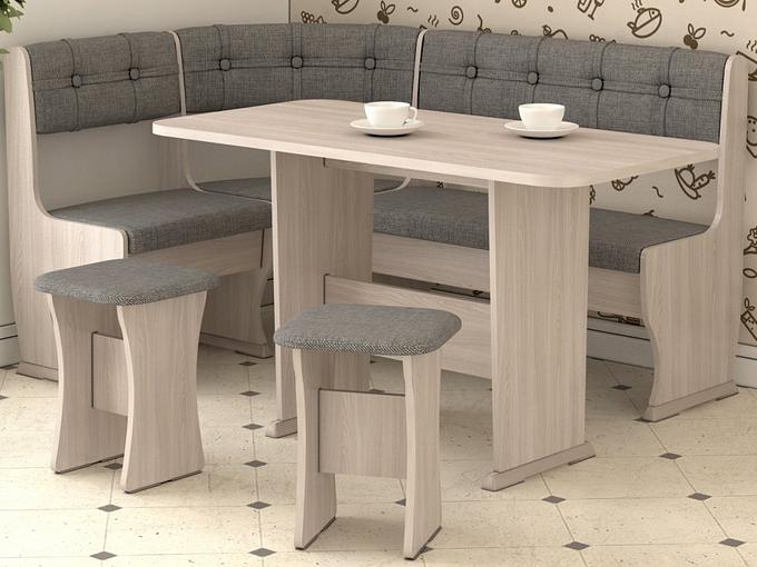 Скамья и табуреты обтянуты тканью «полинейсон серый», с размерами угловой скамьи 1500х1060 мм. Стол размером 1200х600 мм и высотой 730 мм с двумя банкетками размерами 340х340 мм и высотой 440 мм.