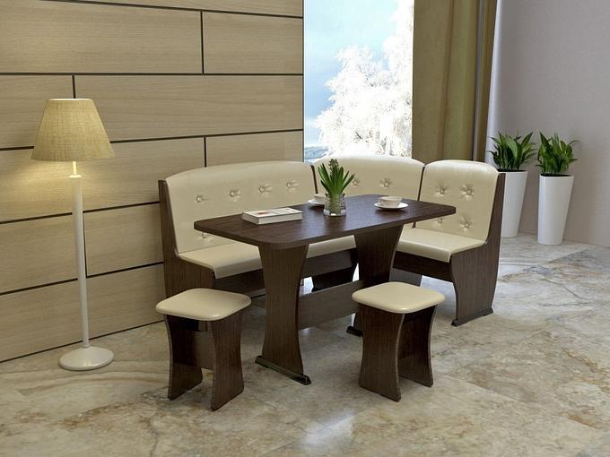 Спинка прошита пуговицами и с верху перетяжка лямкой в цвете кожзам. Стол 1200*600*730 мм. Две банкетки 340*340*440 мм.