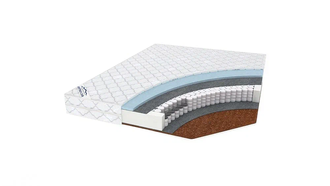Блок независимых пружин TFK Термовойлок 1 ст-на: Пенополиуретан 2см 2 ст-на: Нат.кокосовая койра 1 см Короб по периметру Чехол: жаккард хлопковый, стеганный на синтепоне