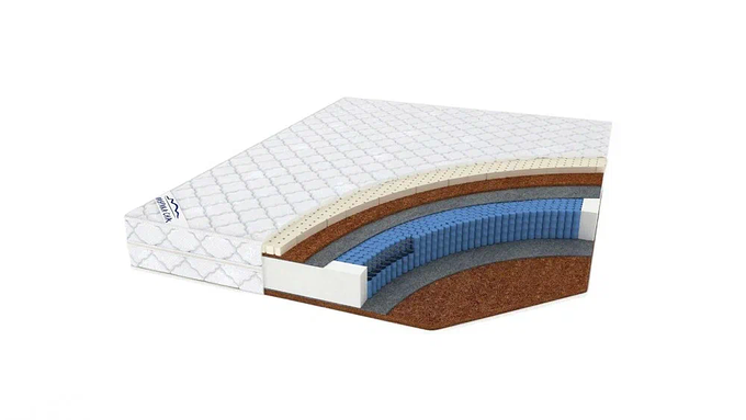 Блок нез. пружин мультипакет Термовойлок 1 ст-на: Натуральный латекс 3 см, Нат. кокосовая койра 1 см 2 ст-на:кокосовая койра 2 см Короб по периметру Чехол: жаккард хлопковый, стеганный на синтепоне Жесткость сторона А - средний, Сторона В – жесткий