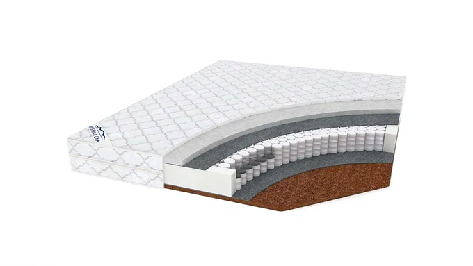 Блок независимых пружин TFK Термовойлок 1 ст-на: Нат. кокосовая койра 2 см 2 ст-на: Струттофайбер 3 см Короб по периметру Чехол: жаккард хлопковый, стеганный на синтепоне Жесткость сторона А - жесткий, Сторона В – средний