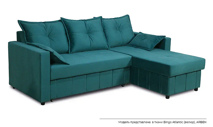 Диван угловой. Каркас сборный, усиленный, из массива древесины хвойных пород. В основе сидений - упругая пружина-змейка, ППУ . Ламинированный короб для хранения в оттоманке. Подлокотники съёмные.