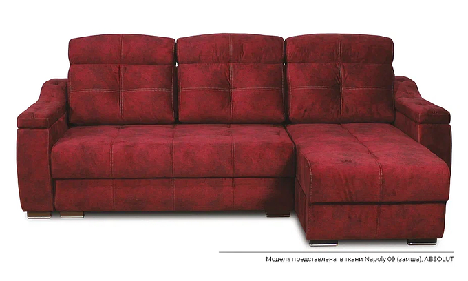 Диван угловой. Каркас сборный, усиленный, из массива древесины хвойных пород. В основе сидений - упругая пружина-змейка, несколько слоёв ППУ . Наполнение подушек - смесь гипоаллергенного синтепуха и дроблёного пенополиуретана. Ламинированные короба для хранения в основном сиденье и оттоманке. Технология скрытых скоб. Задняя поверхность спинки дивана выполнена из парадной ткани. Просторное спальное место. Подлокотники съёмные.