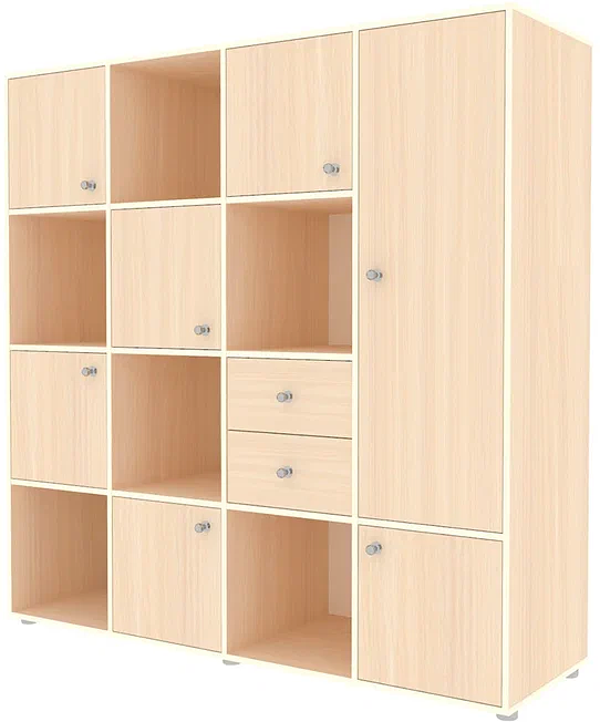 Размер всего стеллажа: 1600х1600х500мм. Шкаф 1165х375х500мм. внутри расположена штанга. Материалы: Мебель изготовлена из ЛДСП. Борта декорированы противоударным кантом. У цветных фасадов светло-бежевая кромка. Модель универсальна - сторона определяется при сборке.