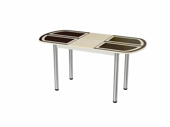 Форма: овальный Столешница раздвижная Столешница стекло - цвет Шоколад, наклеенное на ЛДСП в цвете белфорт Вкладыш ЛДСП - белфорт. Подстолье прямое ЛДСП - белфорт с хромированными ножками. Наличие механизма раскладывания: да