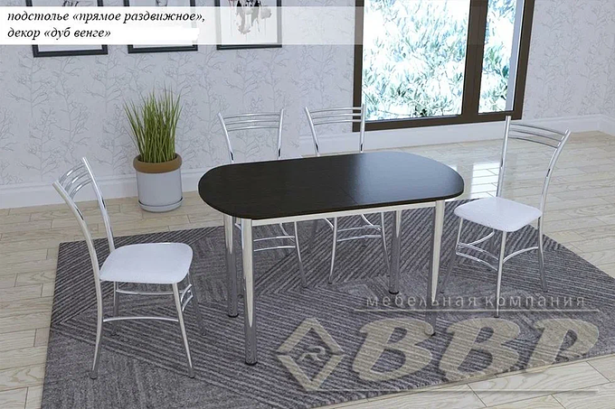 Форма: овал Подстолье разборное Хром. Столешница ЛДСП толщиной 16 мм. в цвете Венге, Сонома, Ясень шимо темный Стол в разложенный 1500*700. Стол сложенный 1100*700 Наличие механизма раскладывания: да1