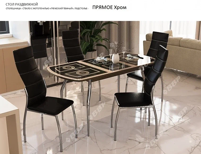 Форма: прямоугольный Столешница раздвижная 1100/1500*700. высота стола 750 мм. Подстолье прямое раздвижное ЛДСП - венге с хромированными ножками. Столешница стеклянная ( стекло наклеено на ЛДСП) с фотопечатью "ГРЕЧЕСКИЙ ТЕМНЫЙ" Наличие механизма раскладывания: да