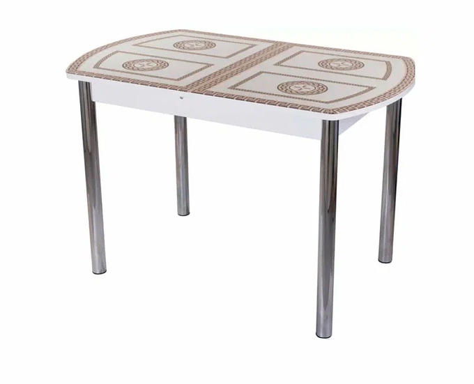Форма:прямоугольный Столешница раздвижная 1100/1500*700. Подстолье прямое раздвижное ЛДСП - белое с хромированными ножками. Ножки диаметром 50 мм. Столешница стеклянная с фотопечатью "ГРЕЧЕСКИЙ СВЕТЛЫЙ". Стекло наклеено на ЛДСП. Механизм раздвижения синхронный . Наличие механизма раскладывания: да