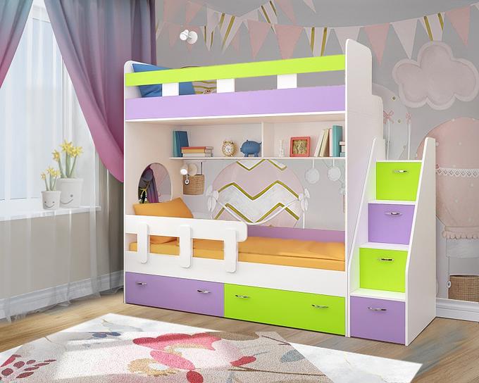 Мебель изготовлена из ламинированного ДСП, с использованием кромки АБС, что позволяет продлить срок службы изделия и сохранить внешний вид. Отсутствие острых углов является самым главным критерием травмобезопасности детей.